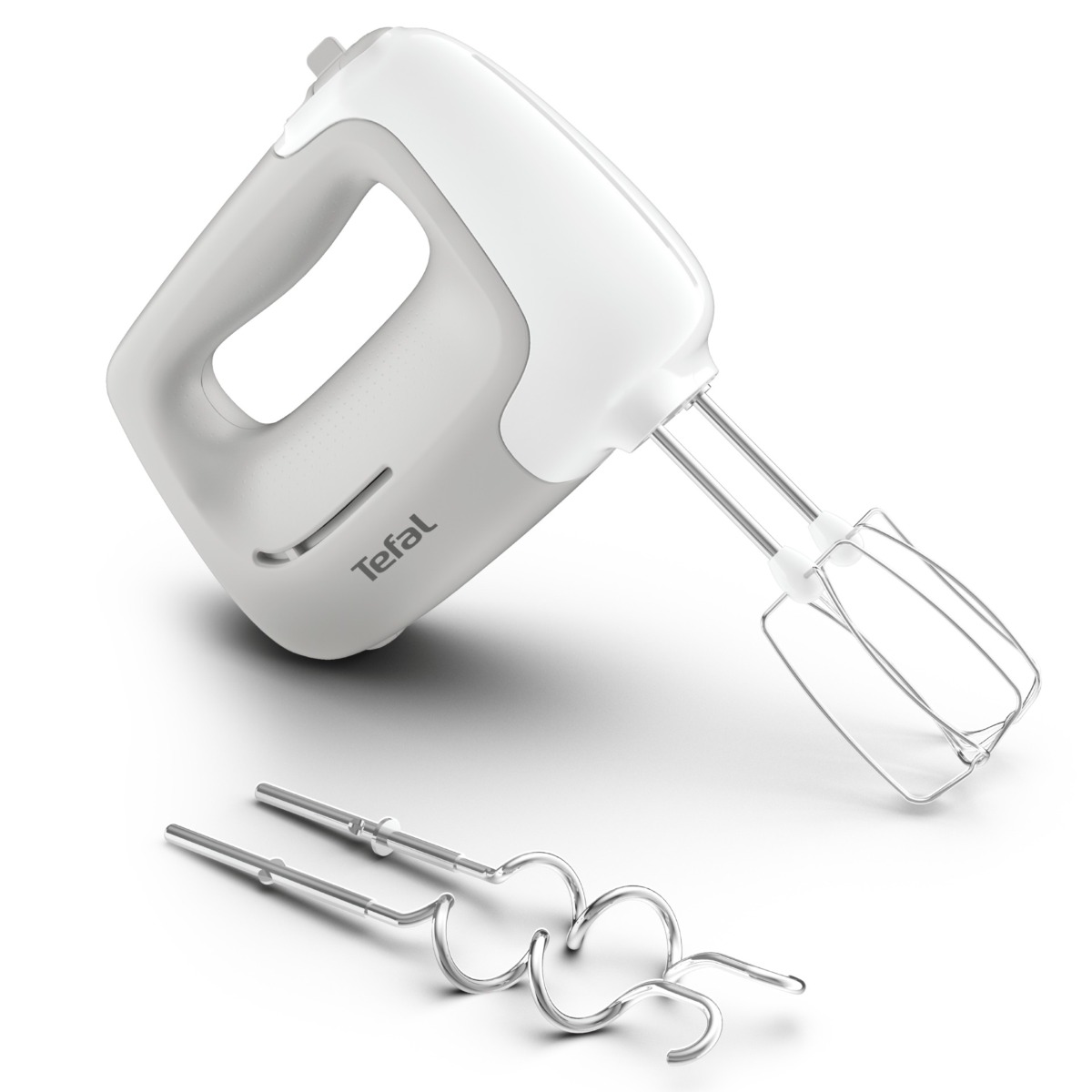 Ручний міксер потужністю 450 Вт, швидкостей 5, функція турбоімпульсу, вінички, гачки для замішування, аксесуари з нержавіючої сталі, ручка з ергономічною поверхнею, стабільне місце для зберігання, знімні частини можна мити в посудомийній машині, сірий колір. Насадки: Віничок, Гаки для тіста.