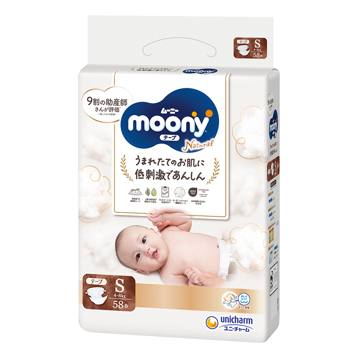 Moony Natural – м’які, ультратонкі та «дихаючі» одноразові підгузки з високоякісних матеріалів та високою поглинаючою здатністю. Вони клінічно протестовані та рекомендовані для використання у дитячій гігієні вже з перших днів життя. Підгузки мають округлу форму, їх еластичні липучки забезпечують додатковий комфорт для малюка. Форма внутрішньої поверхні стала більш анатомічною, завдяки цьому підгузок повністю повторює вигини тіла малюка.