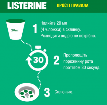 - Особливості складу Aqua / Alcohol / Sorbitol / Poloxamer 407 / Benzoic Acid / Sodium Saccharin / Eucalyptol / Methyl Salicylate / Thymol / Aroma / Menthol / Sodium Benzoate / CI 47005 / CI 42053