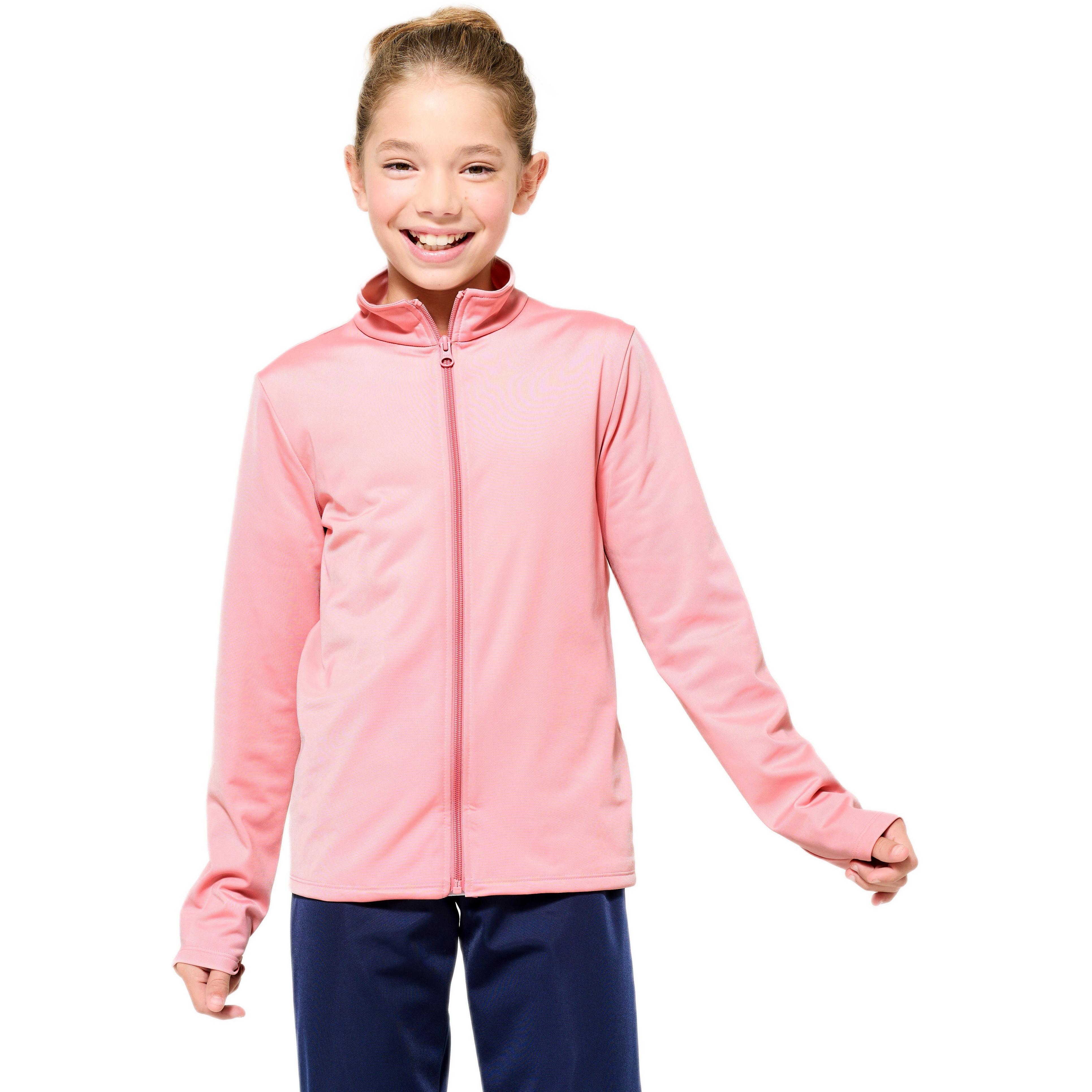 Спортивний костюм Domyos Gym'y S500 ідеально підходить для активних тренувань та щоденного носіння. Він складається з м'якої рожевої кофти із застібкою-блискавкою, та темно-синіх штанів, що мають прямий крій і гарно сидять на фігурі.