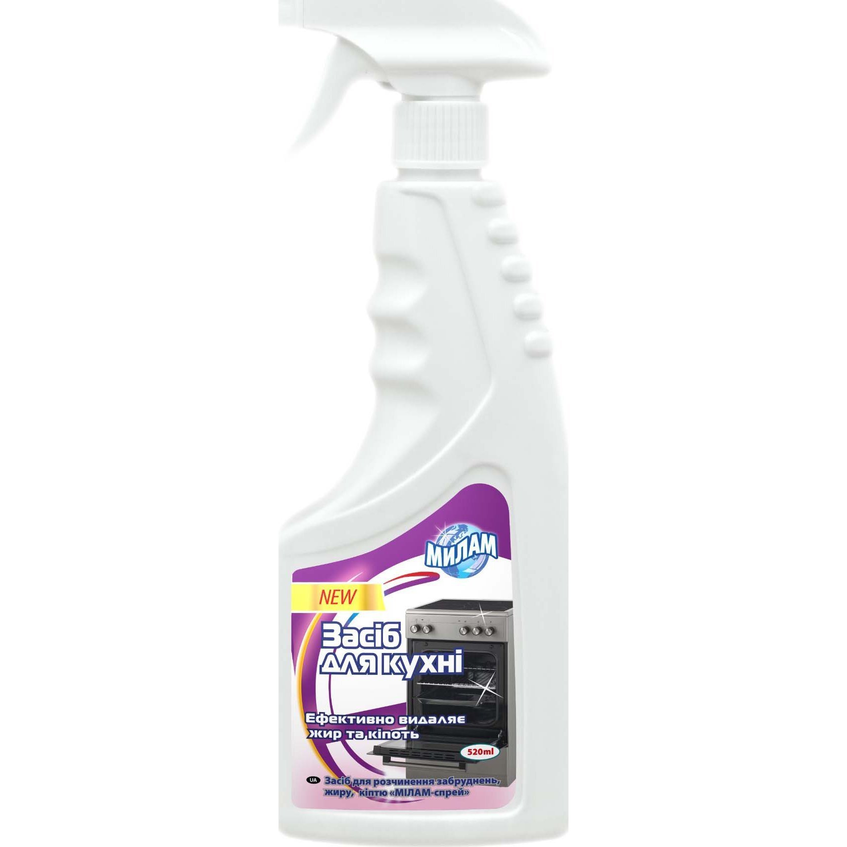 Засіб для розчинення забруднень, жиру та кіптяви "МИЛАМ" спрей. Призначений для будь-яких кухонних поверхонь: кахельних, пластикових, емальованих плит, НВЧ-печей, решіток-гриль, підлоги, раковин, відер для сміття, столів та іншого.