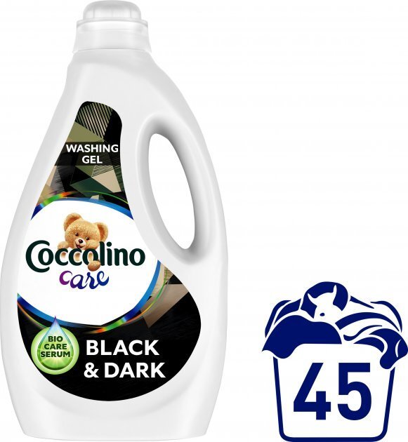 Coccolino care washing gel black & dark – рідкий миючий засіб, спеціально розроблений для догляду за чорним та темним одягом. Формула care serum з унікальною сироваткою глибоко проникає у волокна тканин, забезпечує повноцінний догляд, захист текстилю від передчасного зношування та швидкого вицвітання. Висококонцентрований гель забезпечує ідеальне відмикання, добре виполіскується, не залишаючи на білизні слідів і розлучень. Засіб розрахований на 45 прань і підходить для ручного та автоматичного прання. Гель не містить фосфатів.