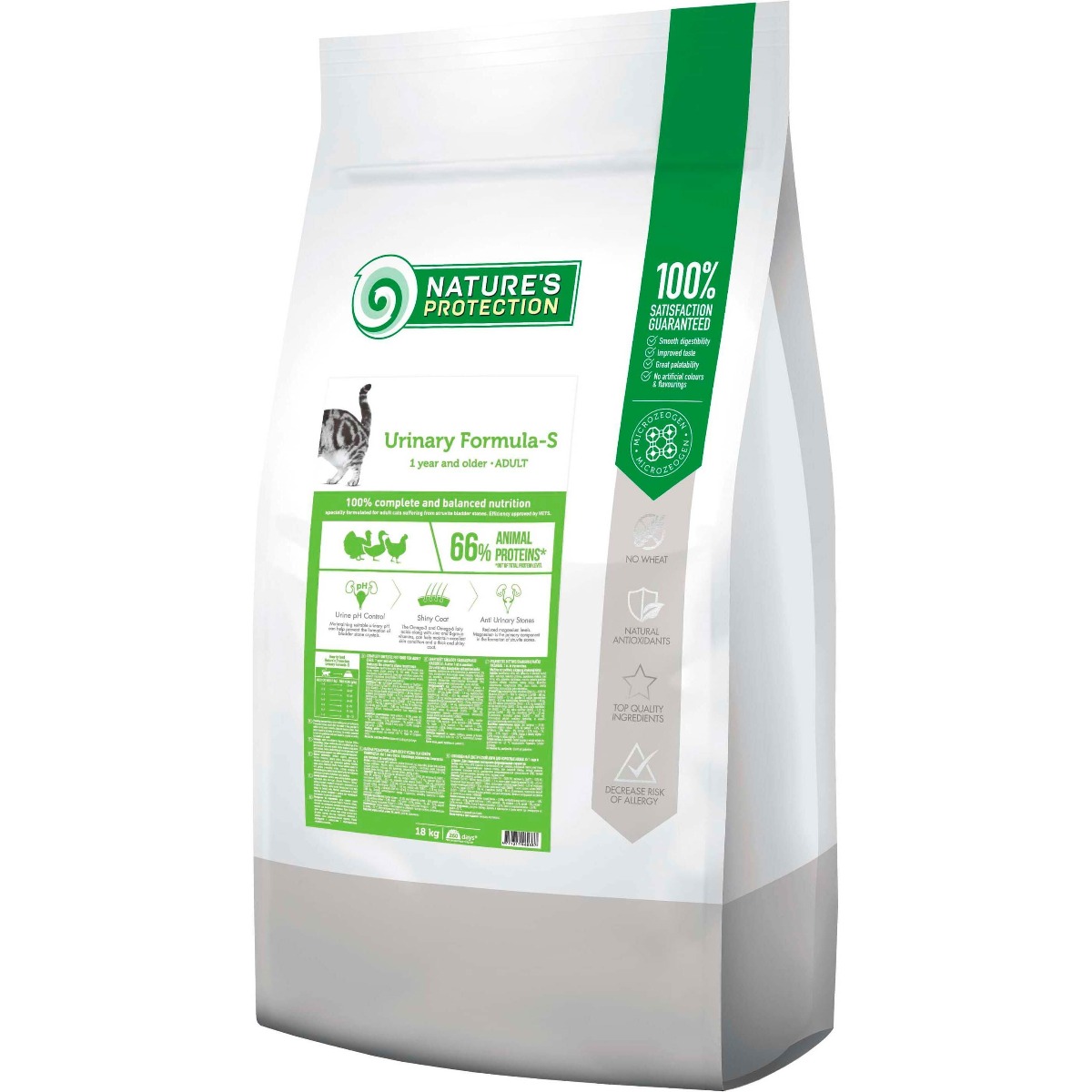 Nature's Protection Urinary Formula-S Adult – сухий корм для котів супер-преміум класу, збалансований для задоволення потреб як молодих, так і зрілих вихованців. Легкозасвоюваний корм має приємний для тварин смак. Сухий корм не містить генетично модифікованих продуктів та штучних барвників. Він призначений для котів, які страждають на сечокам'яну хворобу. Корм містить натуральний мінерал, динамічно мікронізований кліноптилоліт (MZG), який допомагає виводити з організму токсини, а також покращує засвоюваність вітамінів та поживних речовин. Оптимальне поєднання поліненасичених кислот Омега3 та Омега6 разом із натуральними антиоксидантами допомагає підтримати захисні функції організму вихованця.