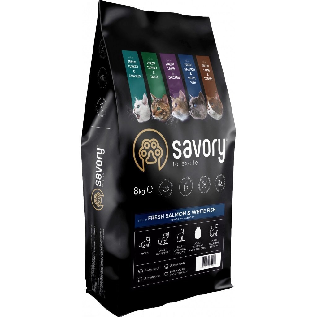Ексклюзивна рецептура корму була розроблена досвідченими європейськими фахівцями з харчування хатніх улюбленців. Використовуючи холістичний підхід, вдалося створити біологічно відповідний, здоровий раціон для кішок, який є таким корисним і смачним, що лапки оближеш. Поєднання добірних натуральних інгредієнтів дає змогу піклуватися про здоров'я чотириногого, а вишуканий смак — дарувати йому насолоду від щоденного споживання корму Savory. Сухий корм для кішок Savory містить свіже м'ясо лосося і висушене м'ясо білої риби, ягоди, фрукти та овочі. Ці компоненти створені природою, щоб забезпечити збалансоване функціонування організму котика та надати його шерсті надзвичайний вигляд.