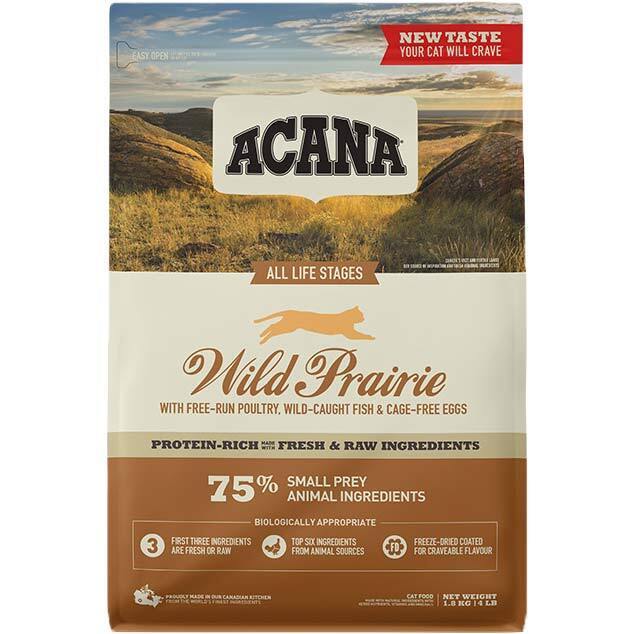 Acana Wild Prairie Cat. Корм для котів всіх порід та всіх стадій життя. Котам необхідні раціони з багатим вмістом м'ясних протеїнів. Надихаючись нашими великими преріями і кришталевими озерами, рецептура Acana Wild Prairie переповнена м'ясними інгредієнтами високої якості: м'ясом курчат і індички, вирощених на вільному вигулі, гніздовими яйцями і прісноводною рибою, виловленою в дикій природі. Всі інгредієнти представлені в співвідношенні WholePrey, включаючи м'ясо, органи, хрящі і їстівні кістки, щоб ваш улюблений вихованець отримував все необхідне для здоров'я, відмінної фізичної форми і благополуччя.