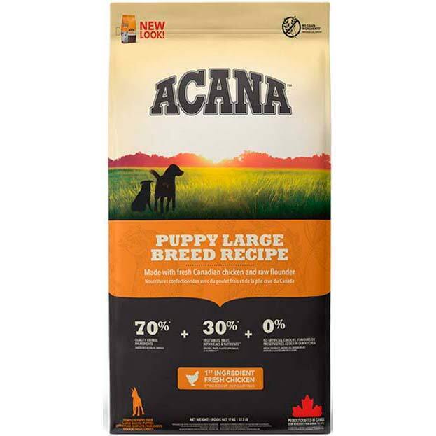 Коли це стосується корму Acana, кожен інгредієнт має значення. Саме тому, рецептура Puppy Large Breed Recipe створюється з турботою та думкою про зростаючих цуценят великих порід. Рецептура Acana Puppy Large Breed на 70% переповнена якісними м’ясними інгредієнтами, такими як м’ясо канадських курчат та сирої камбали та на 30% збалансована фруктами, овочами та травами. Цей раціон забезпечує ваше цуценя протеїнами та необхідними нутрієнтами для підтримки швидкого зростання та розвитку. Рецептура приготована з якісних м’ясних інгредієнтів та збалансована овочами фруктами та травами, що доставляються на кухні компанії Champion Petfoods щоденно. Кожна порція корму Acana Puppy Large Breed забезпечує ваше цуценя харчуванням, так, якби воно прибувало до вас на кухню з фермерських ринків.