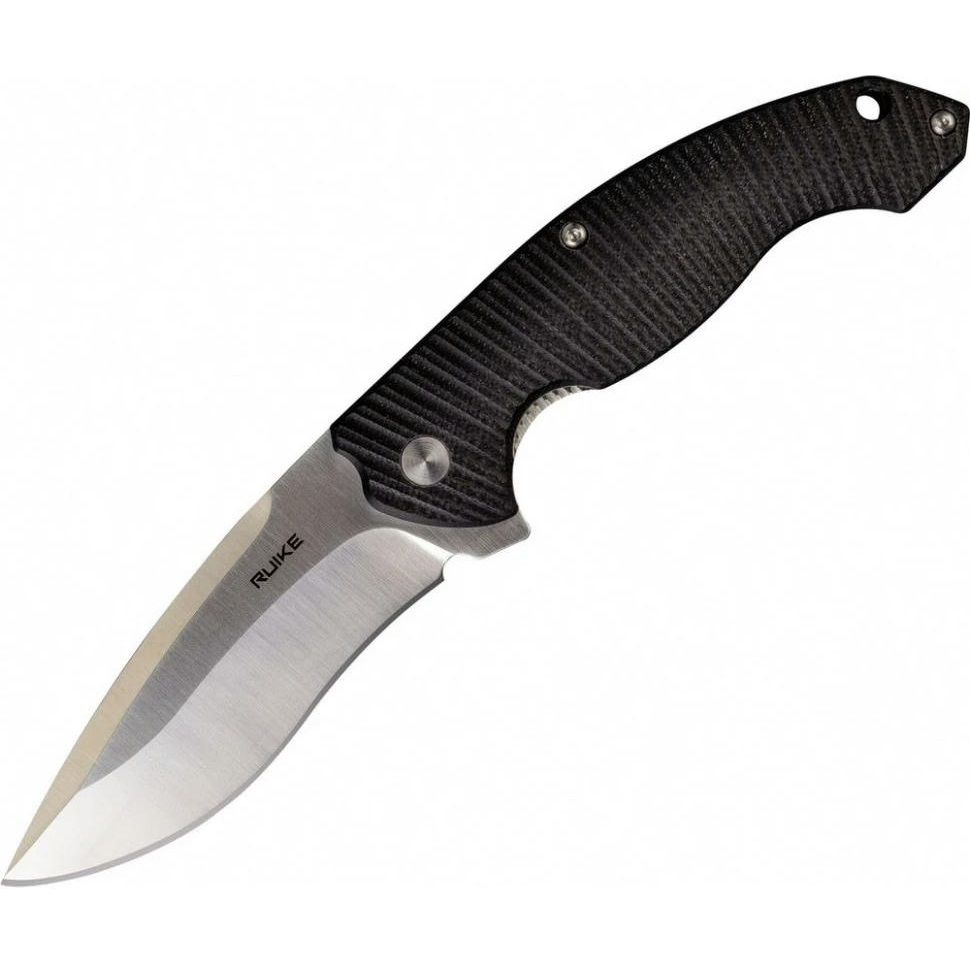 Хороший туристичний ніж повинен бути одночасно надійним і зручним. Ну а якщо він ще й має приємний дизайн, то це тільки плюс для користувача. Модель Ruike P852-B є якраз таким ножем. Вона була розроблена як універсальний інструмент підходить для виконання найрізноманітніших завдань. Лезо представленого ножа має форму Drop-point і гладку заточку різальний кромки, завдяки чому з її допомогою можна здійснювати рівний і акуратний. А за рахунок трохи скошених граней на обуху, він також підходить і для виконання колючих дій, що напевно буде корисно при виконанні ремонту або у приготуванні їжі. Для його виготовлення використовується нержавіюча сталь марки 14C28N, загартована до рівня 58-60 HRC, завдяки чому клинок володіє хорошою міцністю, ударною в'язкістю і не іржавіє після контакту з водою. Приведення ножа Ruike P852-B в «робочий» стан здійснюється за допомогою спеціального «плавця» та вбудованої системи підшипників. А ось блокування клинка у відкритому вигляді проводиться замком Liner-lock. Однією з особливостей цього ножа є наявність запатентованого механізму ThumbUp safety lock, який дозволяє додатково «підперти» основний замок, через що клинок ножа гарантовано не складеться навіть якщо ви випадково зачепите пластину Liner-lock. В основі руків'я Ruike P852-B лежать пара сталевих лайнерів з нержавіючої сталі марки 420. На них своєю чергою встановлені накладки з G10 чорного кольору з фактурною поверхнею. Подібне поєднання матеріалів, а також чудова збірка роблять руків'я ножа гранично міцним і стійким до навантажень.
