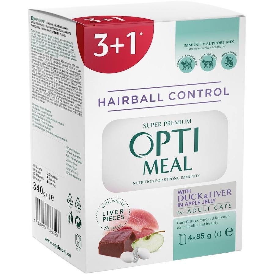 Корм Optimeal для котів з ефектом виведення шерсті з качкою та печінкою в яблучному желе 4*85г