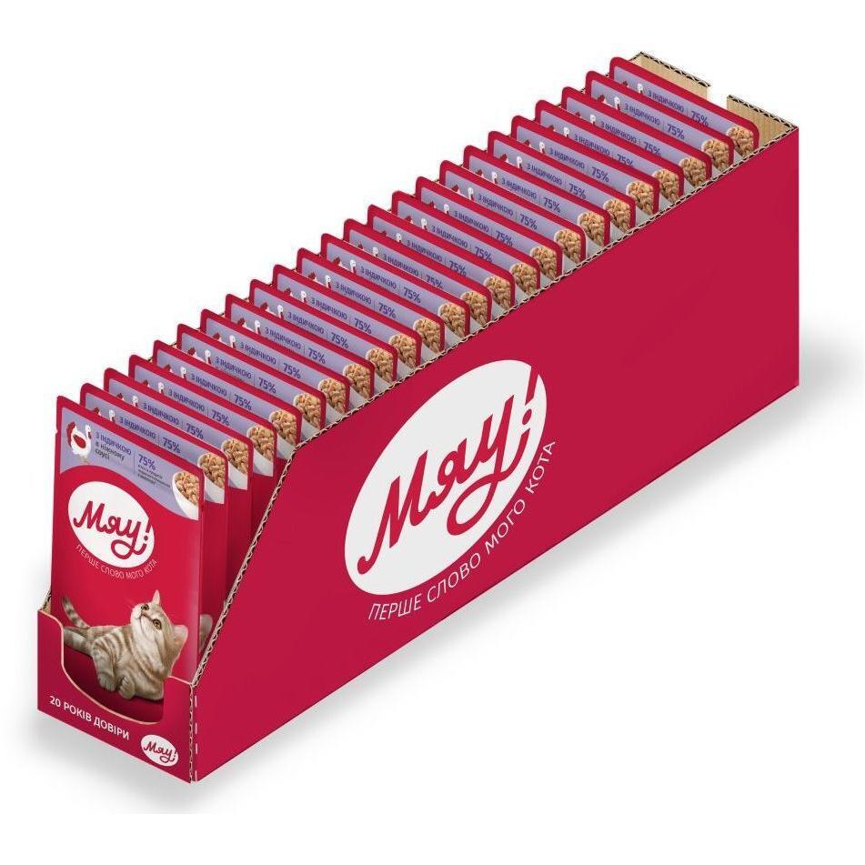 Відгуки про Упаковка вологого корму Мяу для дорослих котів з індичкою в ніжному соусі 24х85г (B2210302)