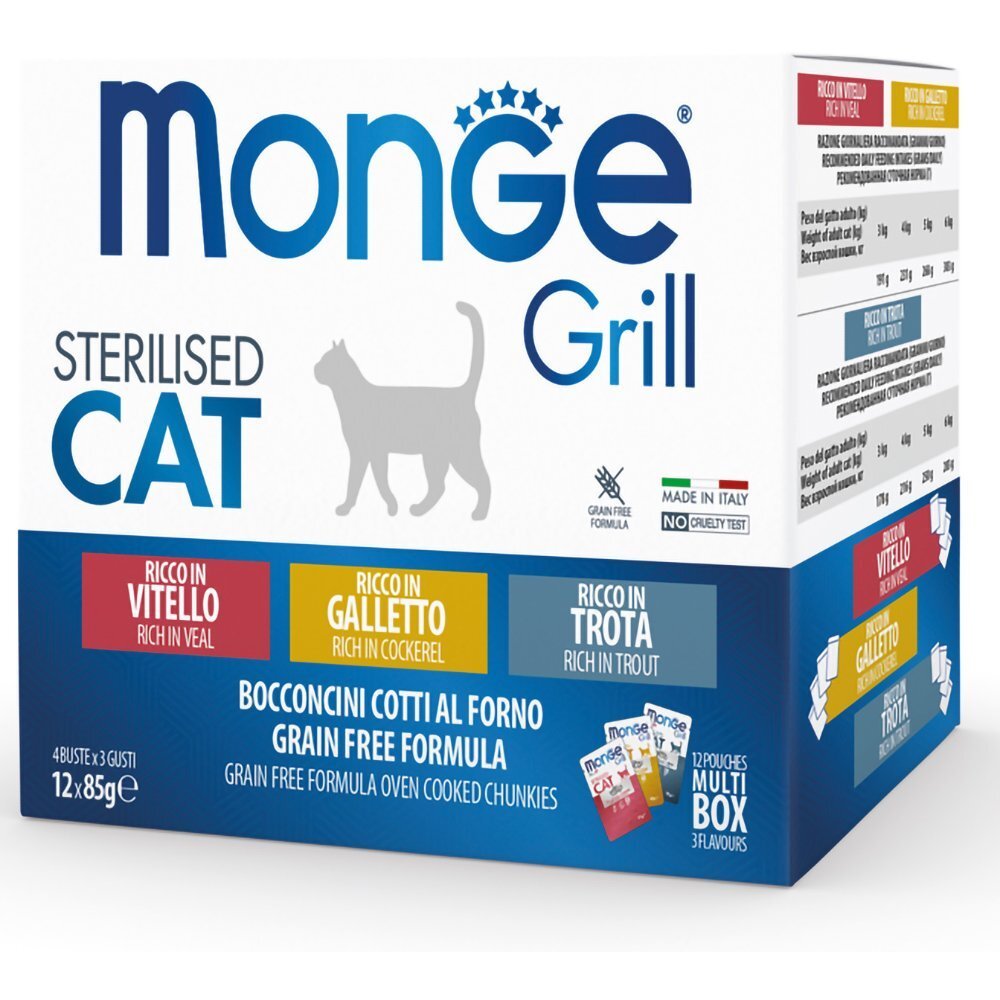 Вологий корм для стерилізованих кішок Monge cat grill з півником, фореллю, телятиною 1.02 кг (8009470017527)
