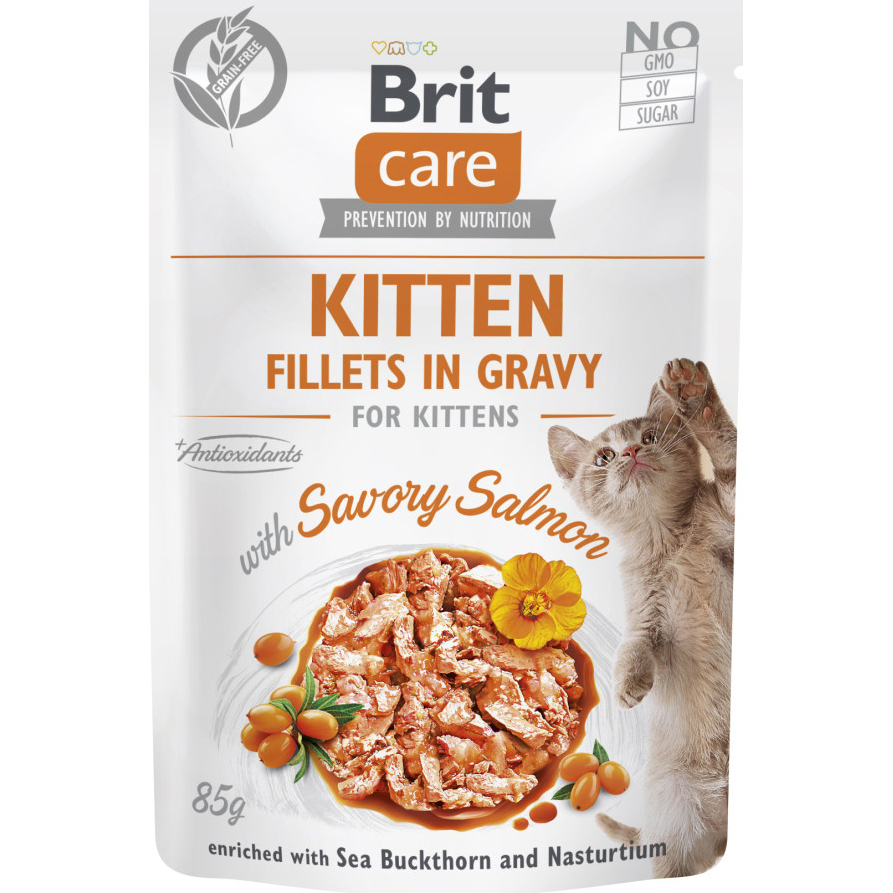 Меню котика має бути різноманітним, смачним і корисним. Делікатесний пакетик-пауч Brit Care можна використовувати як повноцінний корм або як доповнення до сухого корму, для підвищення різноманітності раціону і апетиту у кошеняти. Завдяки доданій обліписі та настурції корм допомагає запобігти захворюванням сечовивідних шляхів.