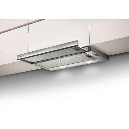 Эта модель интегрируется в навесной шкаф, поэтому будет практически незаметна на кухне. На виду остается только 50-миллиметровая белая панель, на которую нанесено наименование марки оборудования. Встраиваемая вытяжка шириной 50 см и производительностью 350 м3/час будет эффективной в тандеме с небольшой четырех- или трехконфорочной варочной панелью, установленной на кухне с площадью, не превышающей 9 м2.